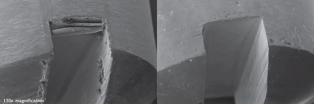 这些“隐形伤口” 在切削时就是大麻烦:高速旋转的刀具与工件摩擦,缺口会不断扩大,轻则加快刀具磨损,重则直接崩刃断裂。更重要的是,现在的加工越来越追求高速切削和自动化,对刀具稳定性要求极高;尤其是涂层刀具,如果涂层前不做钝化,涂层会顺着刃口的缺口“渗入”,稍有震动就会成片脱落,反而缩短寿命。