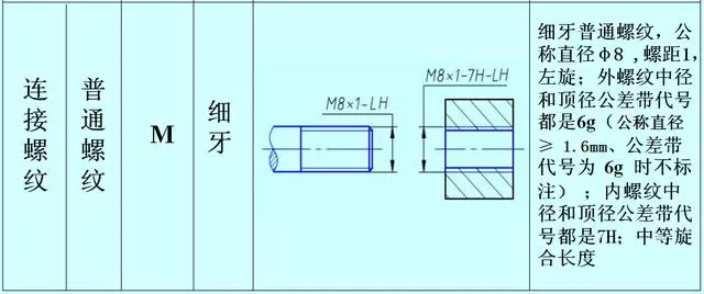 普通螺纹的完整标记由五部分组成。例如:M10×1―7H―L―LH。