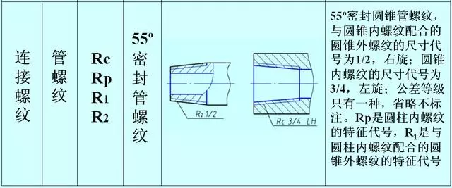 55°密封管螺纹的特征代号:密封圆柱内螺纹Rp,密封圆锥内螺纹Rc,与圆柱内螺纹相配合的圆锥外螺纹R1,与圆锥内螺纹相配合的圆锥外螺纹R2。标记示例如下。