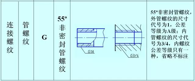 G3/4A或G3/4B: 尺寸代号为3/4的单线右旋圆柱外螺纹, 标记中的A和B是螺纹中径的公差等级;