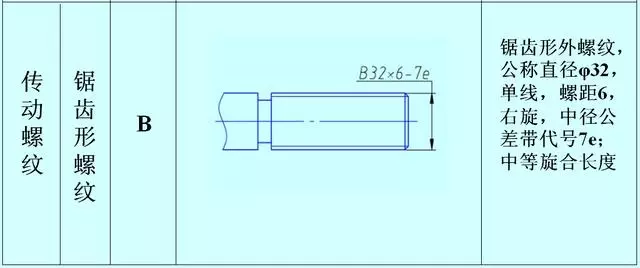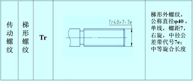 Tr40×7LH-7e:梯形螺纹(螺纹特征代号为Tr),公称直径φ40 ,单线,螺距7,左旋,中径公差带代号7e;中等旋合长度。