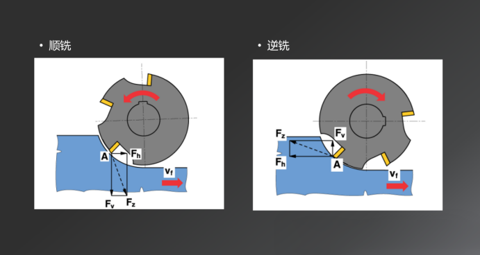 切入瞬间的冲击力,是新手刀具损坏的“头号杀手”,顺铣和逆铣的差异很明显: