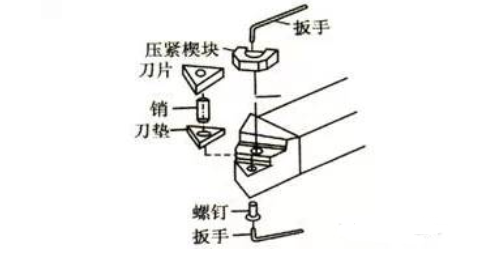 (4)刀片重磨后,尺寸会逐渐变小,为了恢复刀片的工作位置,往往在车刀结构上设有刀片的调整机构,以增加刀片的重磨次数;