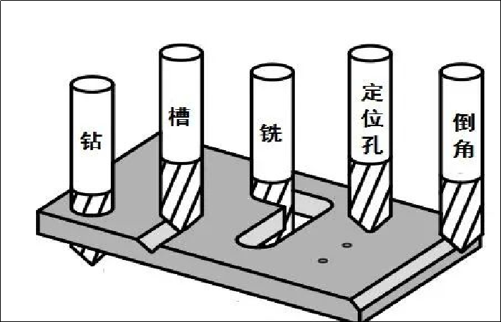 钻头/端铣刀或钻铣刀,很明显这些多功能刀具比标准铣刀的功能更多。名字中就包含了两种操作(钻孔和铣削)。除了显而易见的之外,钻铣刀还用于开槽、打定位孔和倒角,总共可以完成五种不同的操作。