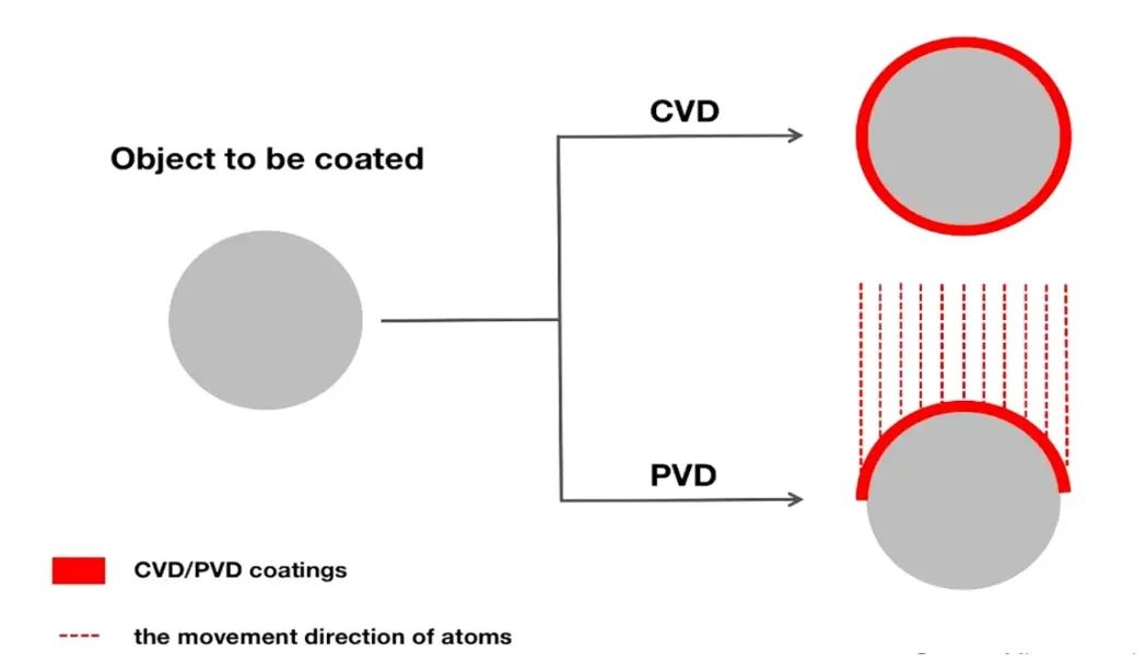 为了更好地理解分子如何在 CVD 和 PVD 中覆盖物体,请看下图: