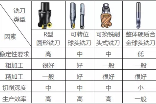 下表在考虑切削加工稳定性,成本生产率等几个方面对这四种常用的仿形铣刀进行了比较: