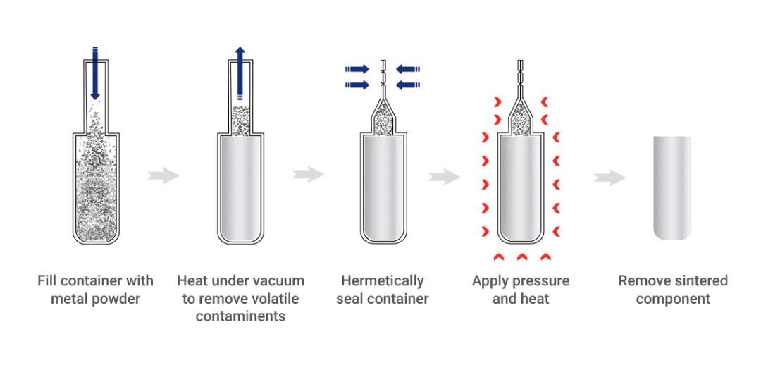 热等静压(HIP):将粉末压实与高温烧结整合为一道工序,属于热压工艺。它结合了高温与等静压的优势,能有效消除零件孔隙、提升密度与机械性能,便于后续加工,同时减少零件微观收缩,提升成品合格率。