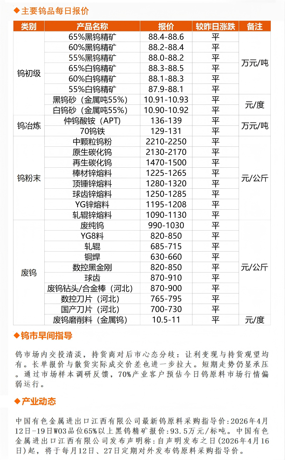- 55 白钨:9690 - 9720 ,环比下跌 100