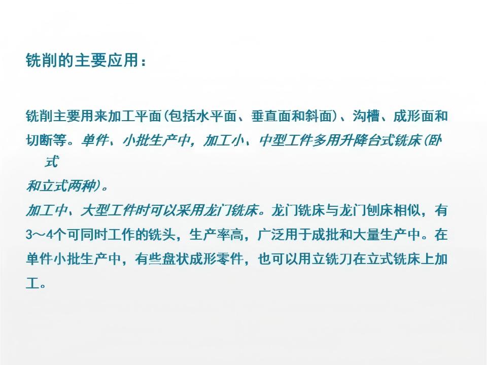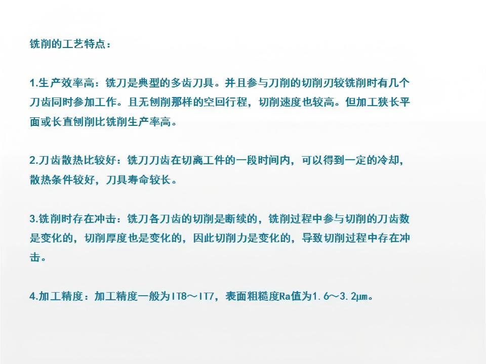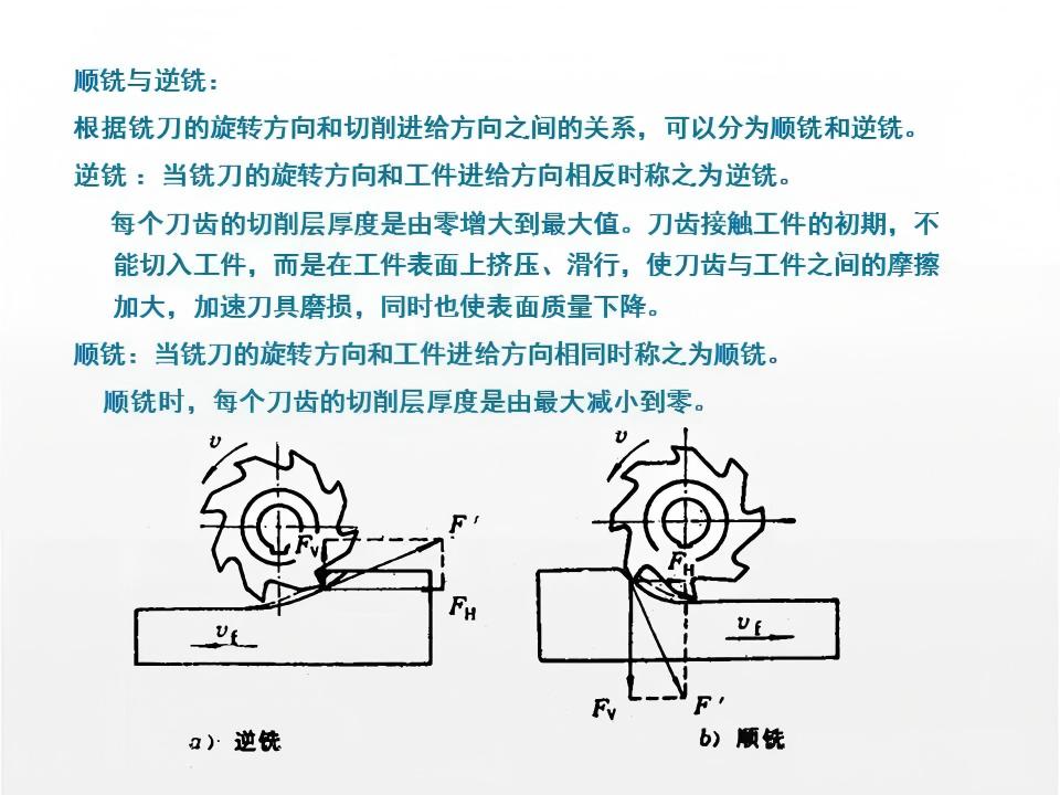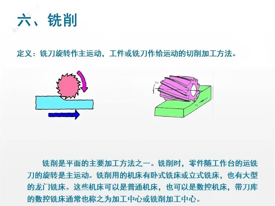 铣削是通过旋转的多刃刀具与工件的相对运动来实现切削加工的工艺,刀具的旋转为主运动,工件的移动为进给运动。