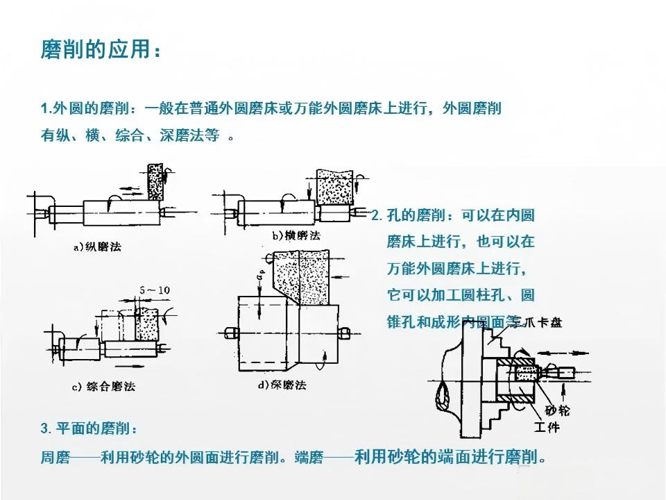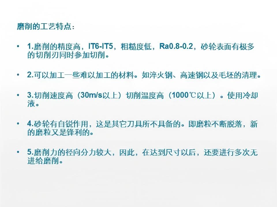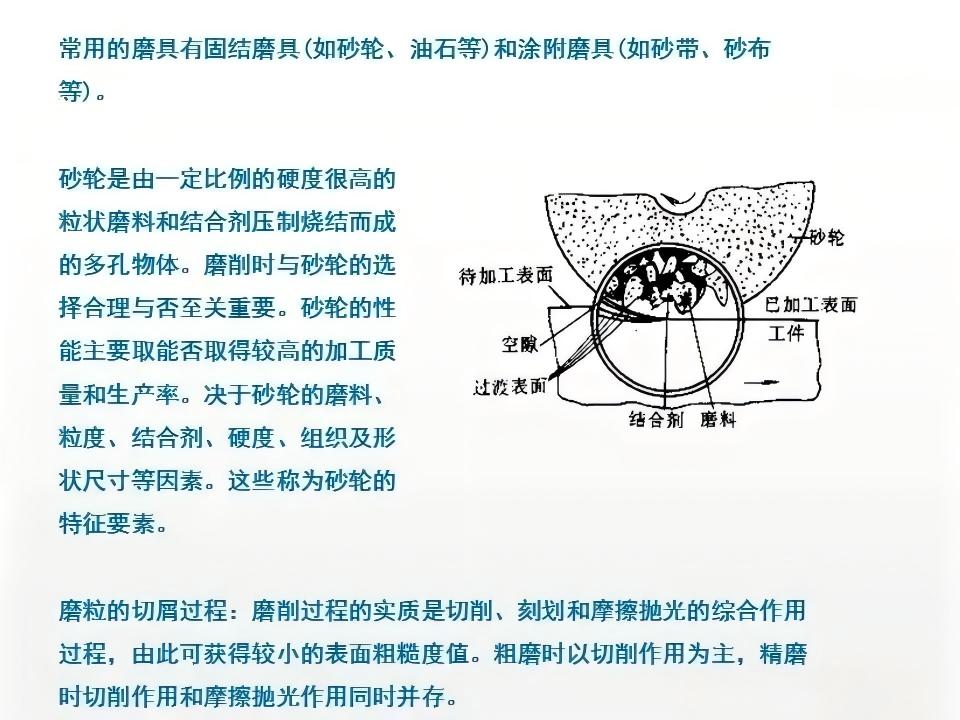 磨削是利用高速旋转的砂轮作为切削工具的精加工工艺,砂轮表面的磨粒相当于无数微小的切削刃,在高速旋转过程中对工件表面进行微量切削。
