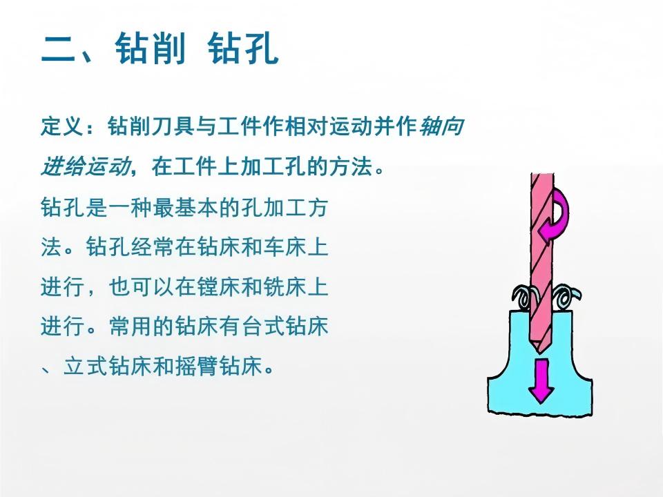 钻削是在实体材料上加工通孔或盲孔的基础孔加工方法,它借助钻头的旋转切削和轴向进给,逐步在工件上形成孔洞。