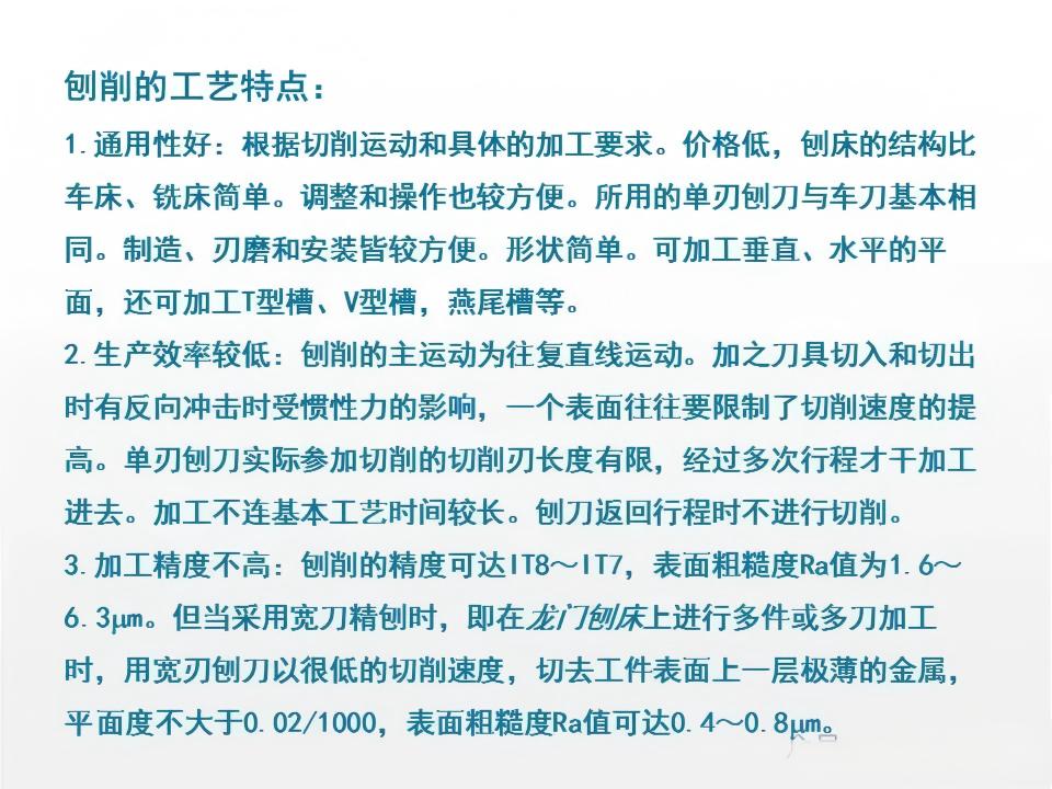 刨削工艺的最大优势在于设备结构简单、成本低廉,常用的牛头刨床和龙门刨床,前者适合加工中小型工件,后者则可应对大型或重型工件的加工需求。不过刨削也存在明显的短板,直线往复运动的加工方式会导致空行程的产生,使得加工效率相对较低,而且加工后的表面质量也不如铣削、磨削等工艺。因此,刨削更多应用于单件小批量生产,或者对精度要求不高的粗糙表面加工场景。