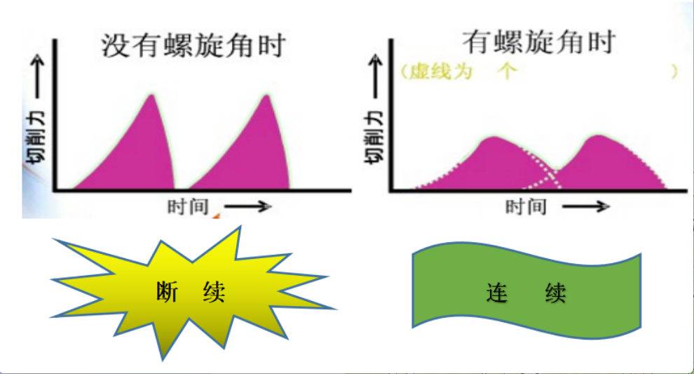 螺旋角铣刀:产生分力,进给方向分力减小,可提高进给速度,切削时易拱起工件,产生震动。